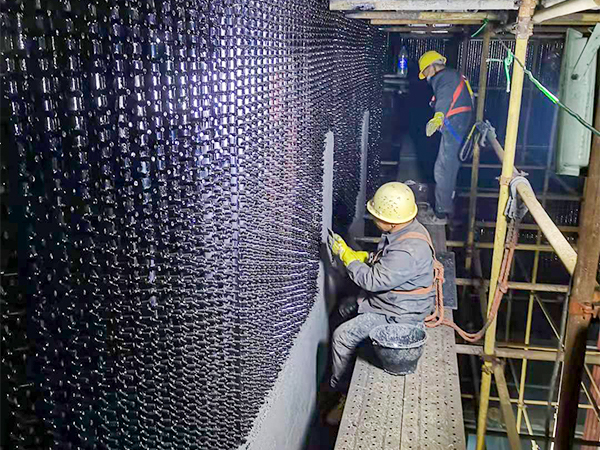 施工現(xiàn)場 CFB內(nèi)襯耐火磚維修砌筑 榮盛耐材施工配電箱 CFB鍋爐爐墻 耐火材料出現(xiàn)開裂、脫落、易磨損怎么辦?想要解決問題,需···