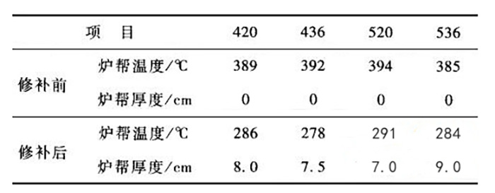 電解槽側(cè)部內(nèi)襯破損部位修補(bǔ)前后爐幫溫度及爐幫厚度的測量對(duì)比分析結(jié)果見表2。